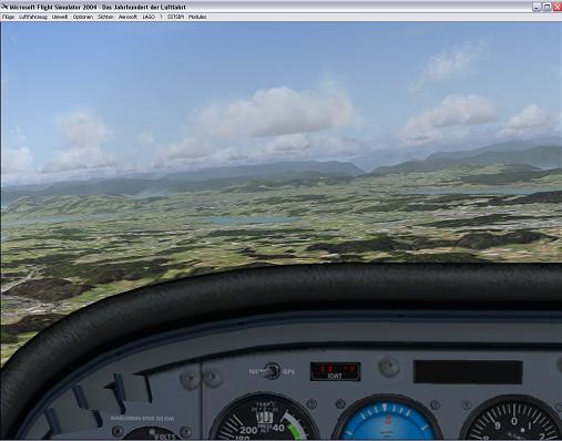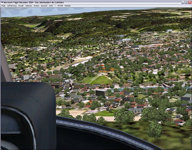 Das kann ab einer bestimmten Flughöhe extrem realistisch aussehen, nur wird es etwas befremdlich, wenn man in geringer Höhe fliegt, weil sich dann die abgebildeten Häuser und Bäume als rein zweidimensional herausstellen: die Welt wird eigenartig flach.